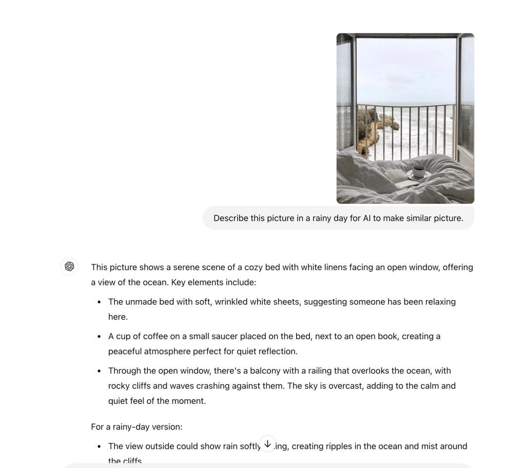 找到參考圖片之後,我們可以把圖片上傳到ChatGPT或者其它AI,請它幫忙把這個圖片寫成prompt。也可以再加上一些自己想要補充的信息,比方說光線、前景、背景等敘述。