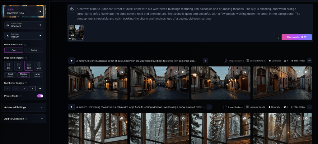 進入到這個頁面之後就可以將剛剛產生的prompt貼到中間的文字框裡面,直接按下紫色的“Generate”就會產生圖片。左邊有各種參數可以調整包含風格、產生的圖片數量、對比度、產生以速度快or品質好優先、圖片的長寬比例,大家可以試一試。