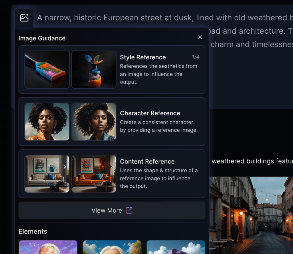 有時候AI生成的圖片還是跟我們想像的有些差距,或者有想要更改的配色、花紋難以用文字表達。那麼我們可以加入參考圖片幫助AI生成圖片。"Content Reference"可以讓AI擷取到參考畫面的構圖,“Style Reference”可以讓AI擷取參考畫面的配色、光線、紋樣,用這兩個輔助功能可以大大幫助我們調整到想要的視角、構圖和色調。