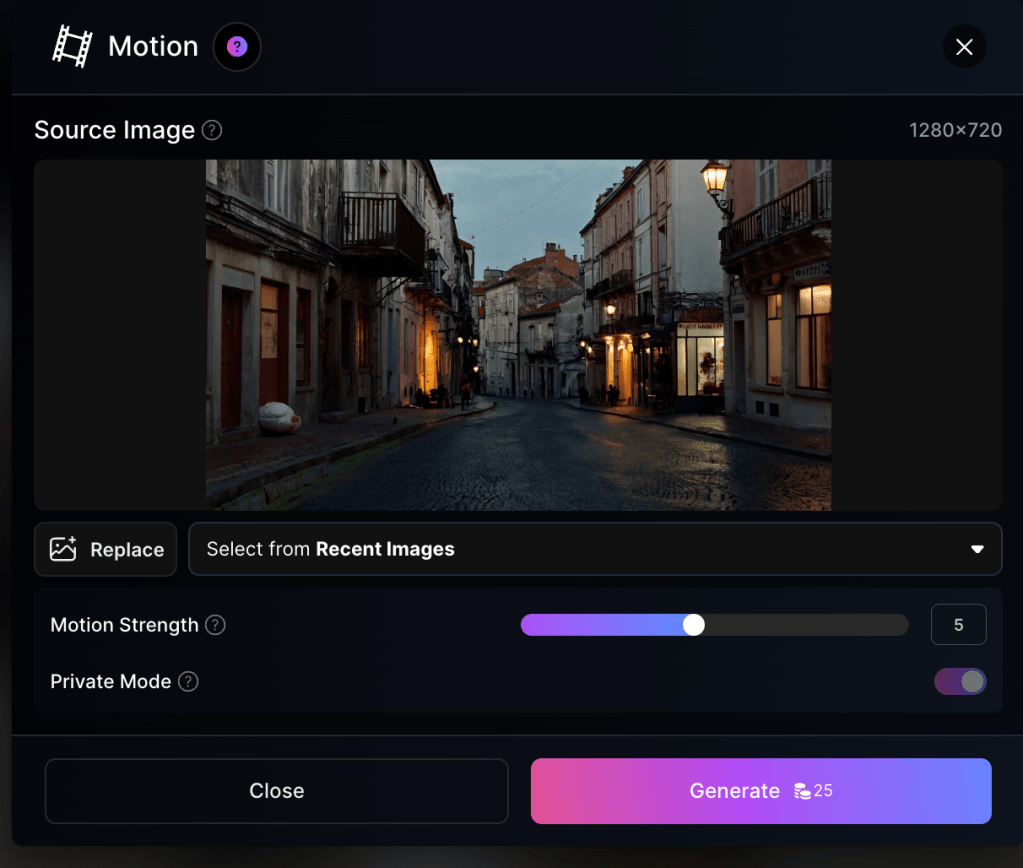 按下之後可以調整“Motion Strength”就可以動畫的強度,之後AI可以生成4秒左右的動畫。大家可以製作多個動畫或圖片之後,在剪輯軟體裡面再把它拼成一個完整的作品,也可以利用這些短動畫製作Youtube Shorts或是IG Reals。