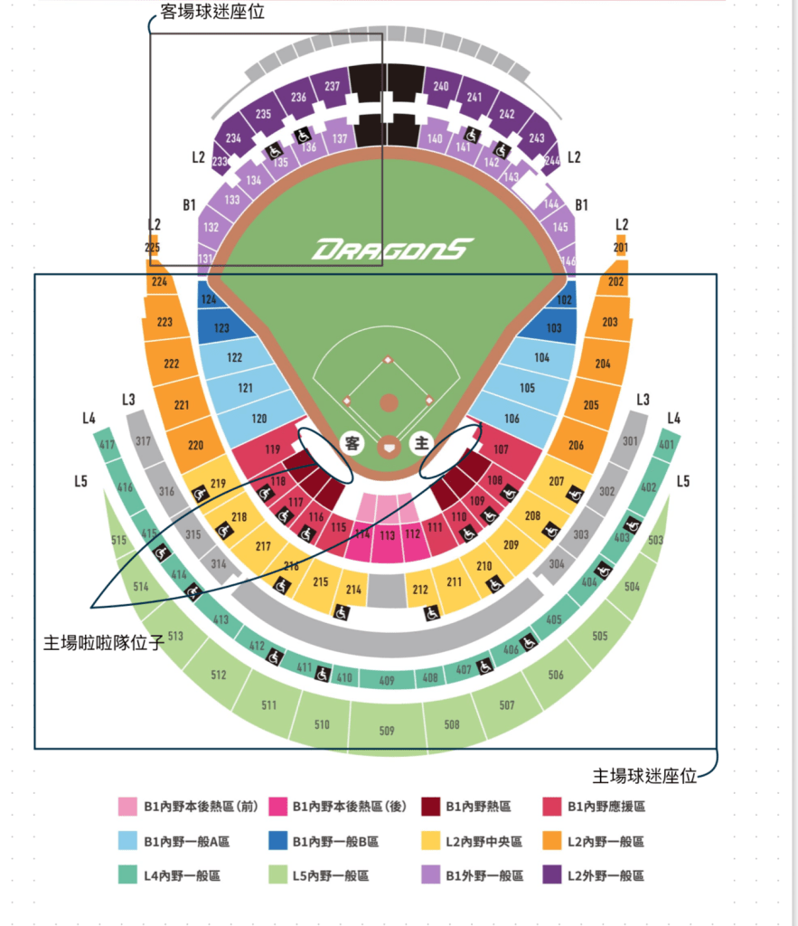 各隊球場都有不同的設計,所以在這裡我們以大巨蛋為範例給大家參考不同的位子的視野及特色,大家在購票的時候可以到各球場參考唷。