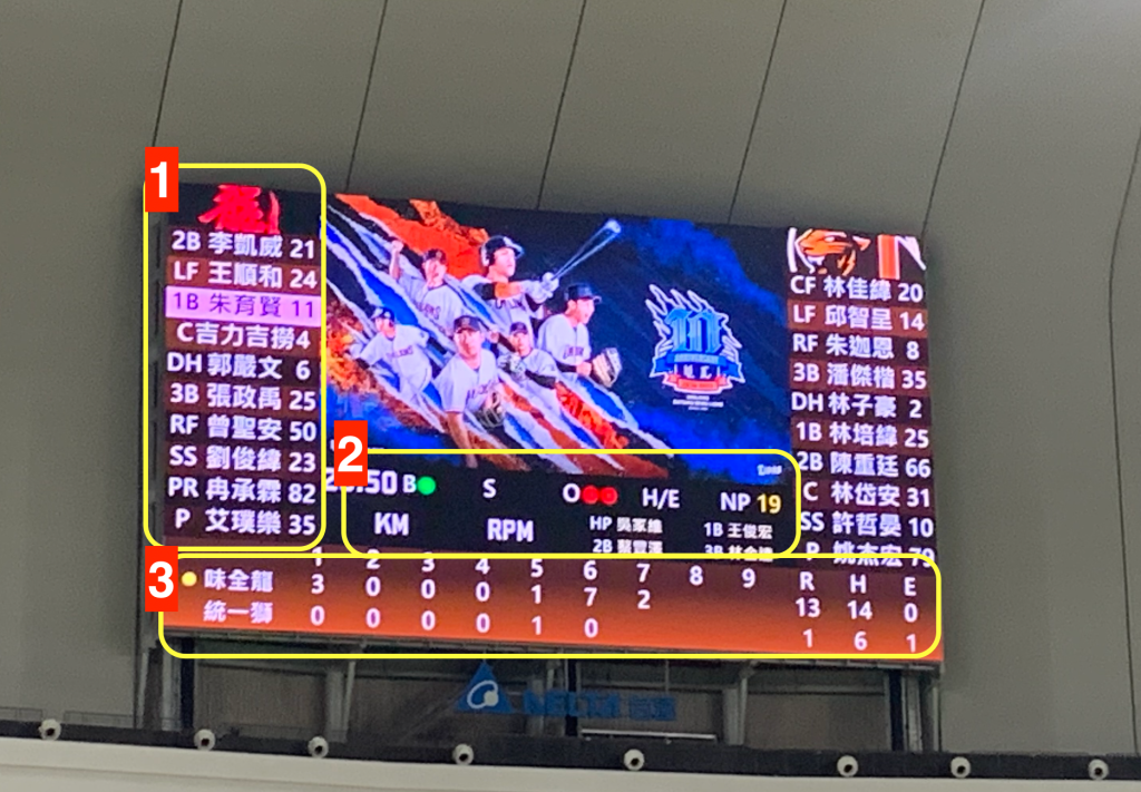 - R、H、E則分別代表總得分(Run)、總安打數(Hit)及總失誤數(Error)。