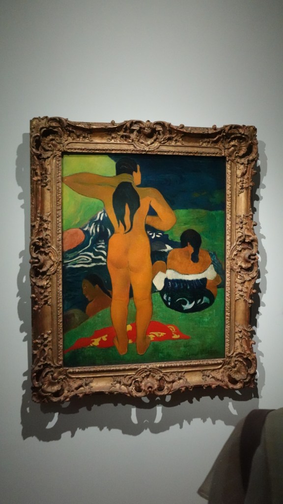《大溪地的出浴女子》是高更對歐洲的生活感到倦怠,前往南太平洋的大溪地創作的作品。這幅畫有明顯的輪廓線,用鮮明的色彩平塗產生強烈的對比,是高更標誌性的風格。這類型的風格受到日本浮世繪的影響,缺乏景深和透視。