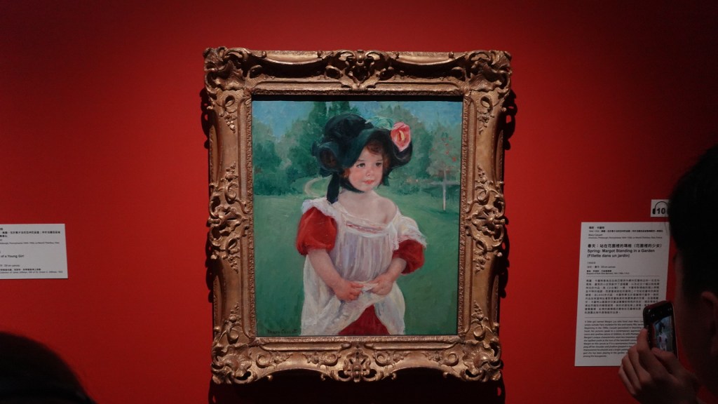 瑪莉.卡薩特生於美國,在母親的支持下移居法國,成為印象派當中少數的女性畫家。她的作品有許多展現當時女性以及母嬰之間的日常,《春天:站在花園裡的瑪格 》這幅畫展現小女孩的靦腆,小手還緊抓著衣襬,畫面光影與色彩生動自然,與其說是畫一個肖像,更像是捕捉一個時代的孩童的生活方式。