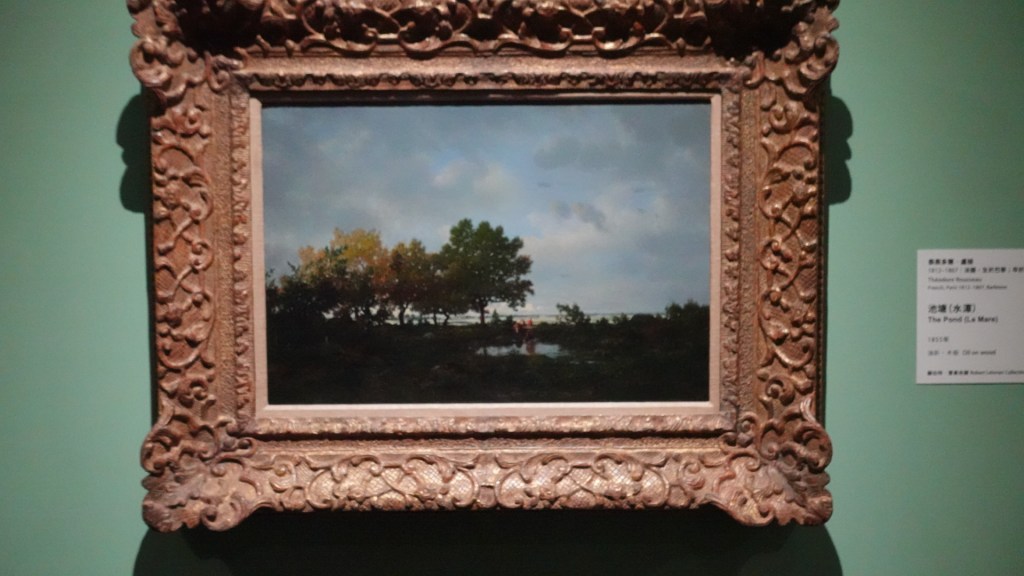 《池塘》是盧梭於1855年創作的油畫,展現了盧梭對於光線與空氣氛圍的掌握,整體色調柔和,以大地色、灰藍色為基調,以精細的筆觸和對數目細膩的觀察展現瞬息萬變的大然。前景是倒映著天空、牛隻和周圍植被的池塘,旁邊有顏色從綠到黃的樹木,遠景是通透開闊的土地。細膩充滿寫實性的風景畫,是巴比松畫派典型的作品。