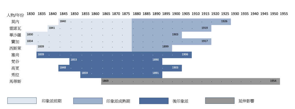 | 前期背景 | 柯洛、庫爾貝、馬內 | 寫實主義 → 打破學院派 |