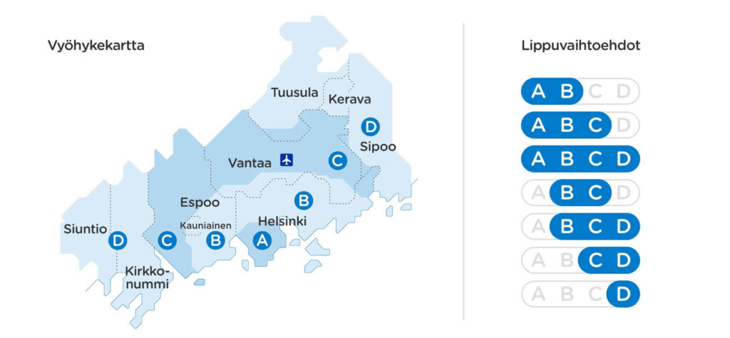 赫爾辛基的買票邏輯是將赫爾辛基分為ABCD區,機場在C區,D區幾乎不會去,而平常會活動的景點主要都在AB區。如果要從機場到市區,可以買"ABC"這個單程票,意思就是可以在ABC區當中自由搭乘任何交通工具90分鐘(市區到機場大概50分鐘內),平常在市區旅遊可以買"AB"區域的日票、三日票,就可以在時間內無限次數搭乘往返AB區之間,包括可以搭船去芬蘭堡。