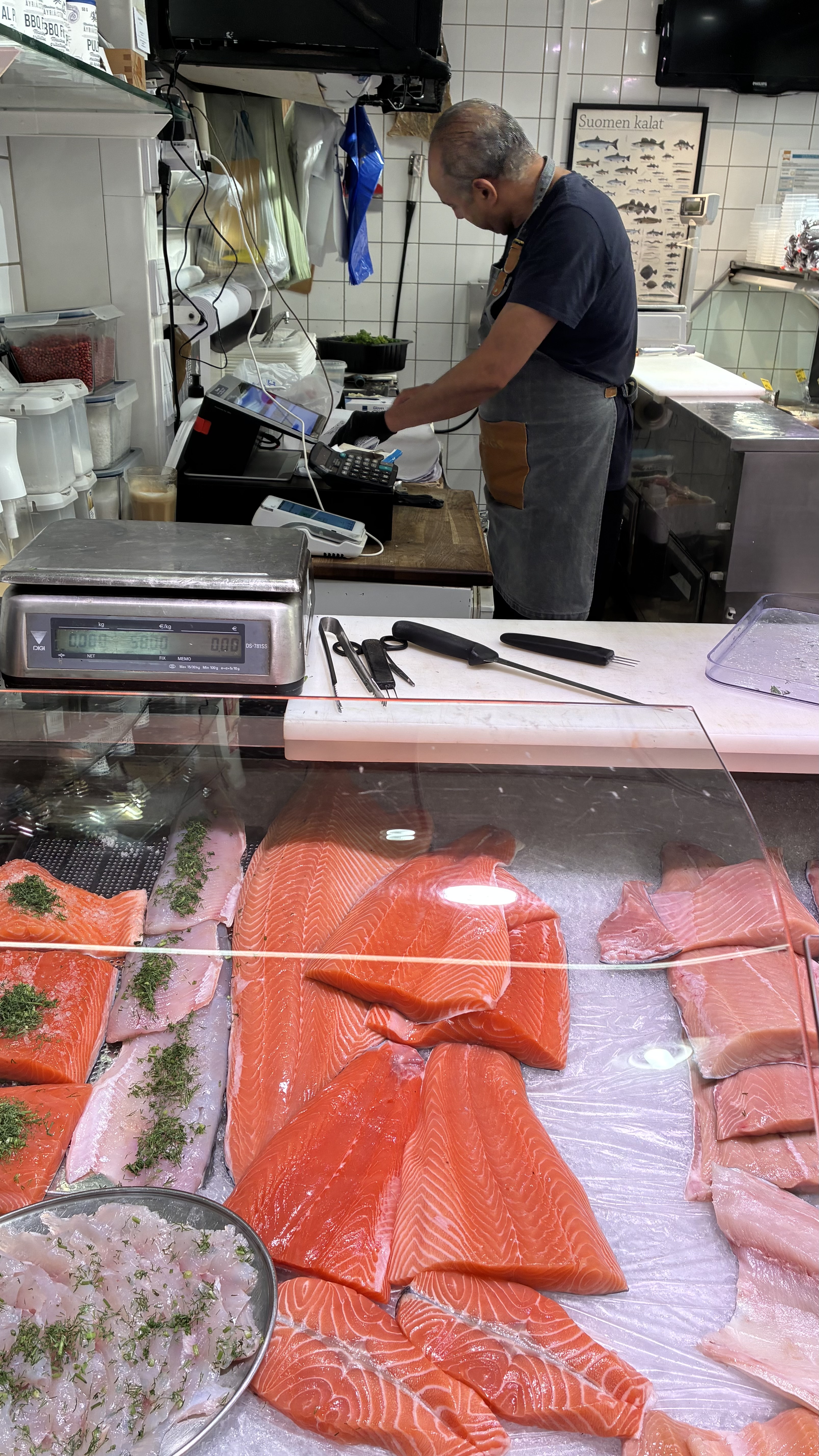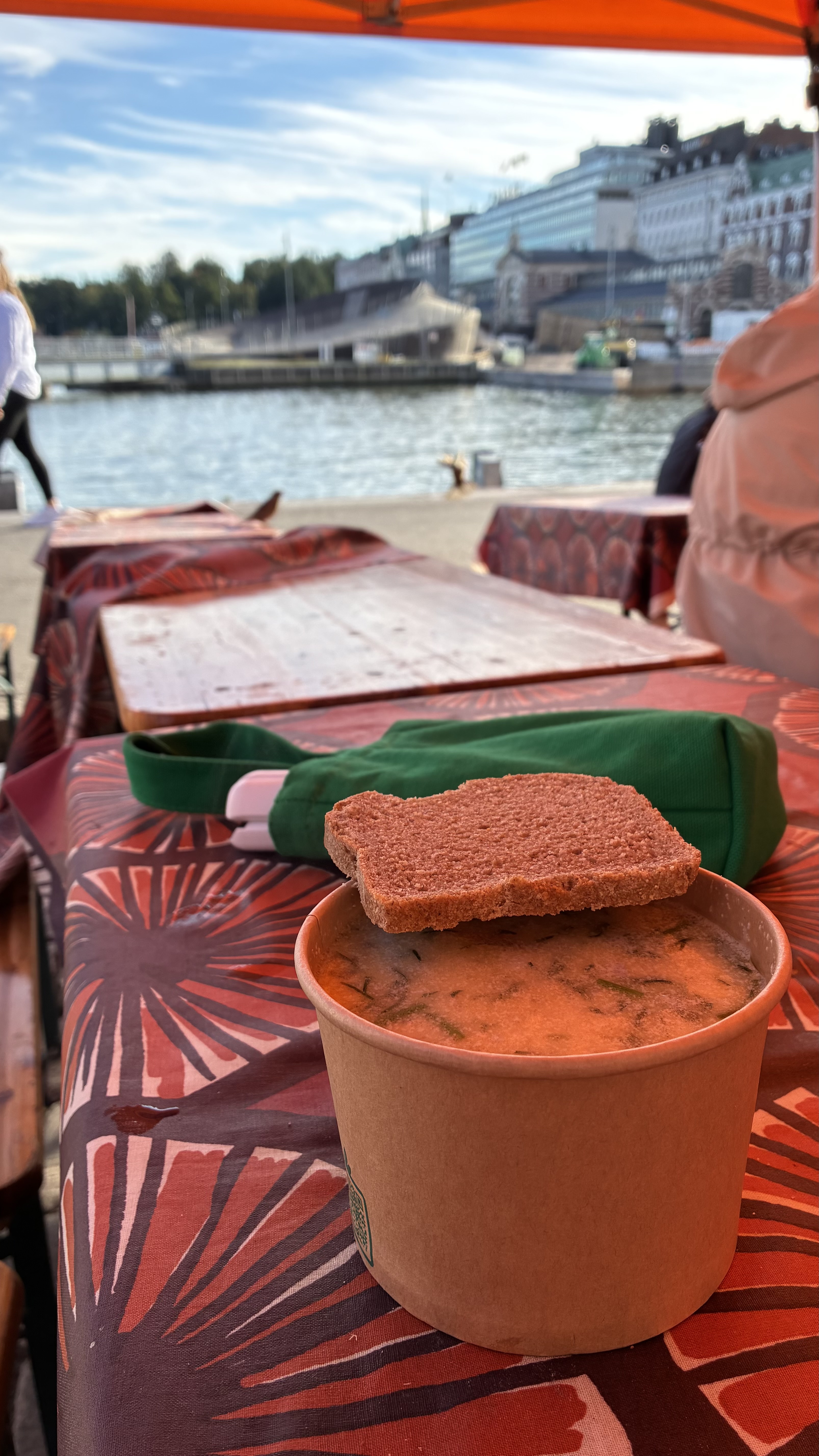 鮭魚湯的價格分布在11-18€之間,11€的是老農貿市場外面的廣場(Kauppatori),有好幾家攤子都有賣鮭魚湯,有點像是夜市的攤子的感覺,湯比較小碗,但可以嘗試看看。老農貿市場 (Vanha kauppahalli)裡面有很多家都有賣鮭魚湯,11:00左右開始賣的店家會比較多,價格大約在14€左右。另外我也推薦Hakaniemi Market Hall,是另外一間市場,價格也在14€左右,我還趁關門前買了一點生魚片。Hakaniemi Market Hall這間市場除了海鮮和麵包之外,也有蔬果、糕點、堅果、起司、茶、咖啡、香料,雖然小小的,但有公共區座位,因為飯店離這間市場比較近,我蠻喜歡早上去點一杯茶坐在公共區享受自己的時光。