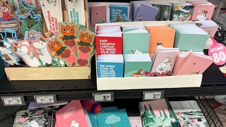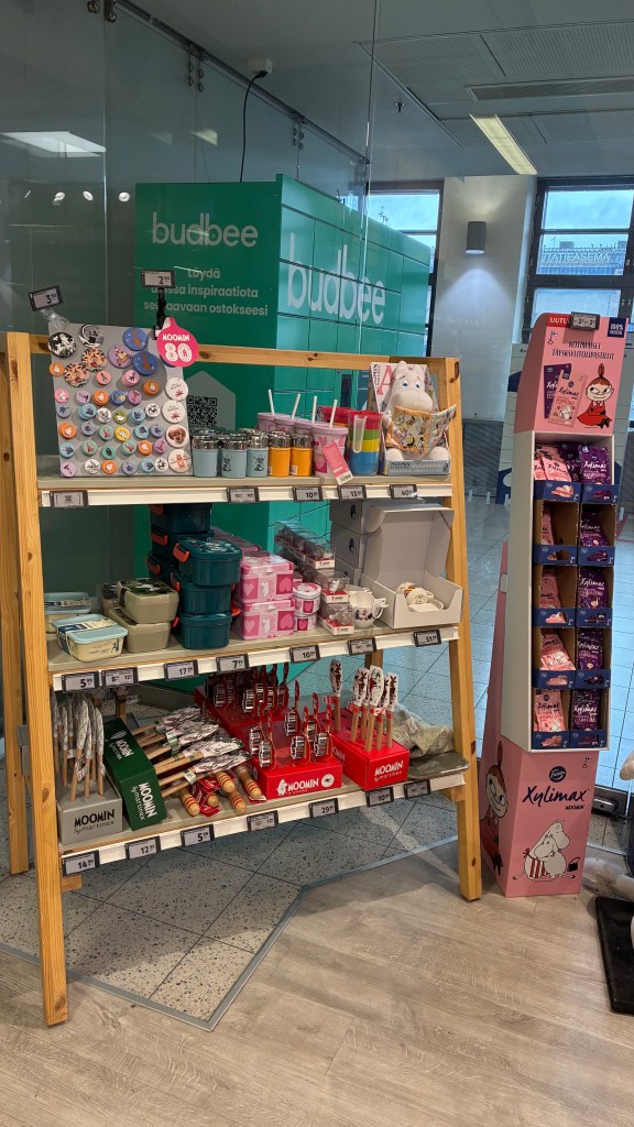 芬蘭的超市很好逛,有新鮮的果汁、優格、熱食,在高物價的北歐,超市是填飽肚子最經濟實惠的場所。芬蘭的Moomin(姆明, 我們好像常叫他嚕嚕米)是很有名的插畫,在赫爾辛基到處都可以看到Moomin的身影,如果你想要買一些Moomin相關的紀念品,可以先“不要”到Moomin的專賣掉(市區有兩家, 機場也有),可以到超市裡面先逛逛,價格比專賣店也比機場便宜許多,有Moomin的茶包、餅乾、襪子、筆記本、明信片、糖果、盒子、貼紙…,可以先挑一挑,如果還沒挑夠再去專賣店買唷。這邊附上有Moomin小角落的K-Mart,在中央火車站附近唷。
